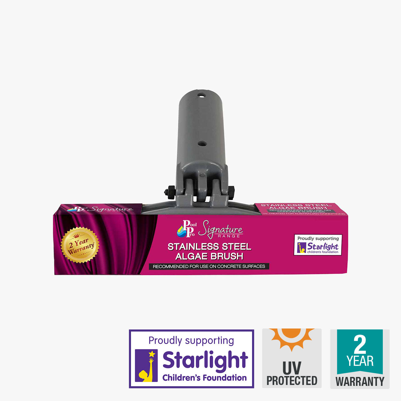 This 22cm Stainless Steel Algae Brush from our Signature Range is UV treated for Australian conditions. It features adjustable angle for handle and suits concrete surfaces, ensuring an effective clean. Plus, 50 cents from each purchase goes to the Starlight Children's Foundation. Comes with a 2 year warranty.